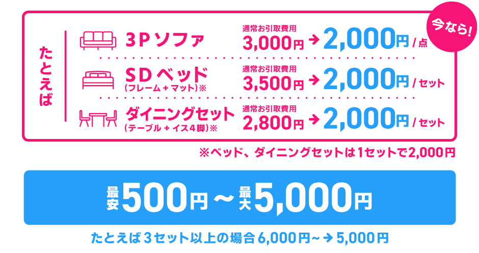 ※ご成約品と同等、同数、お届け先と同じ場所からのお引取りに限ります。※当社指定エリアに限ります。※お買い上げ金額が3万円未満の場合は別料金となります。※玄関お渡しは対象外です。※通常お引取費用が2,000円未満の場合は通常料金で承ります。※一律2,000円のアイテムを3点以上お引取りの場合は、最大5,000円で承ります。